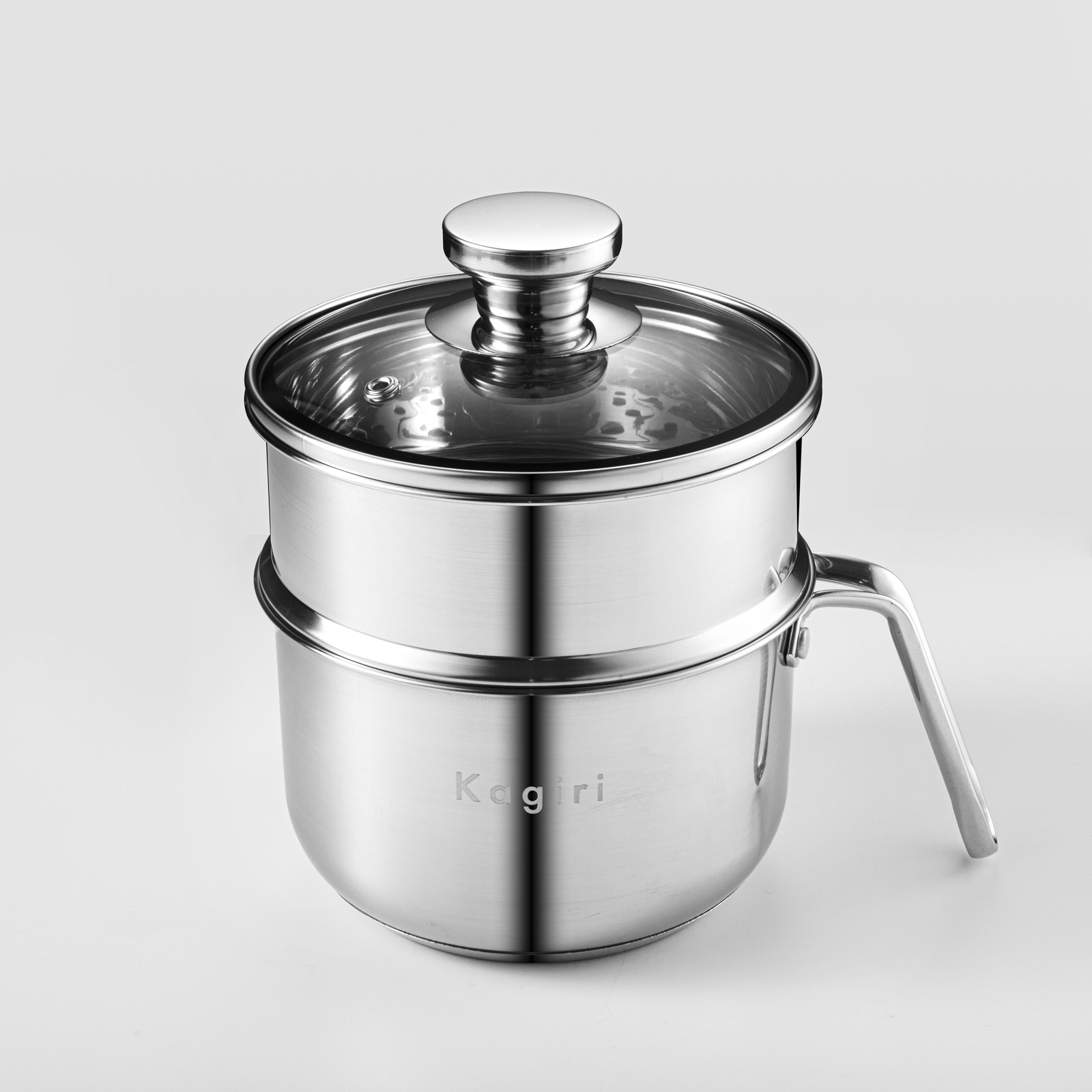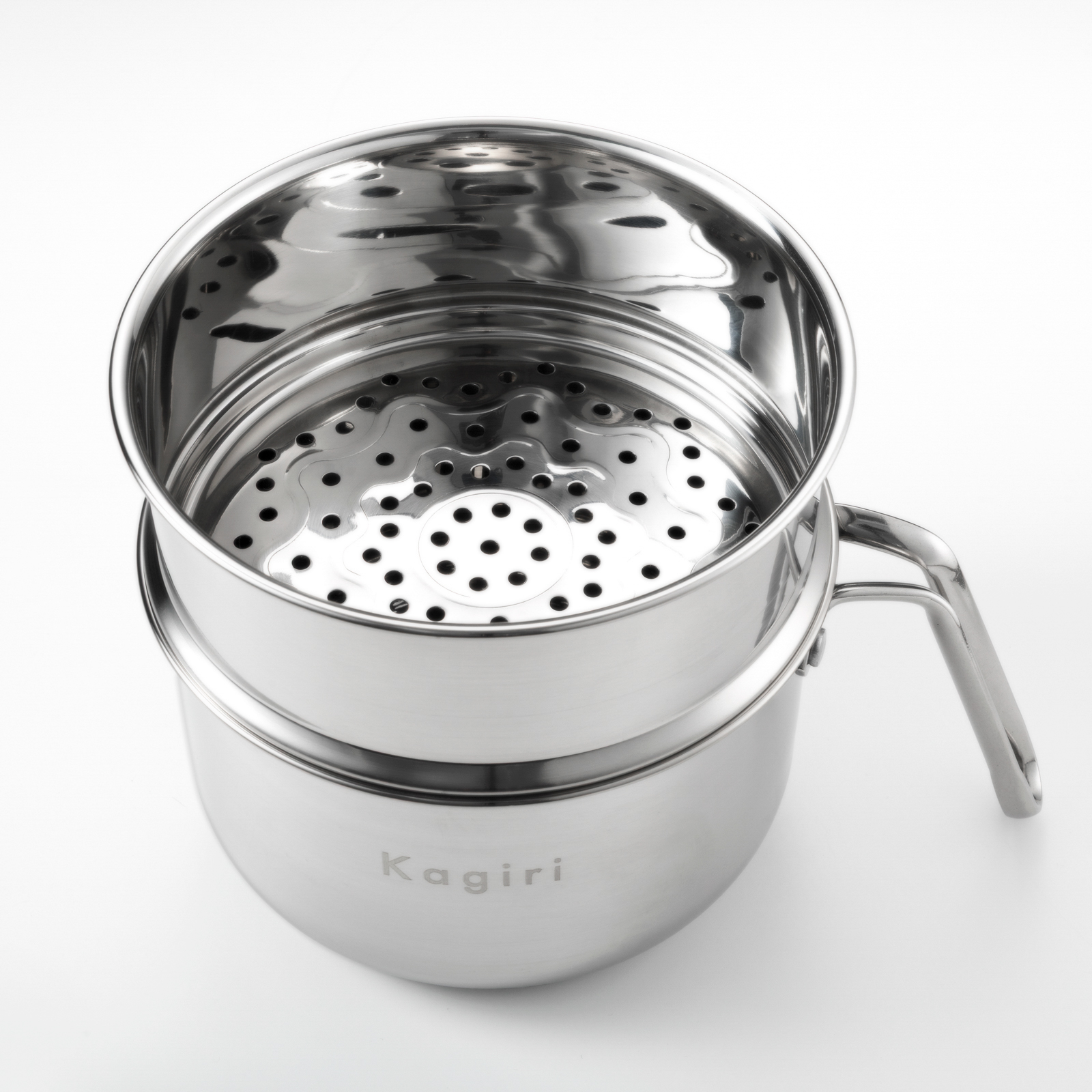 IHコンロとガスコンロのどちらでも使用でき、使う場所を選ばないのが魅力。スープやラーメンなど1〜2人分にちょうど良い1.9Lサイズで、ひとり暮らしから家族まで幅広く対応します。鍋と蒸し器を重ねて同時に調理できる2段構造の蒸し器付きで、時短調理や省エネにも役立ちます。