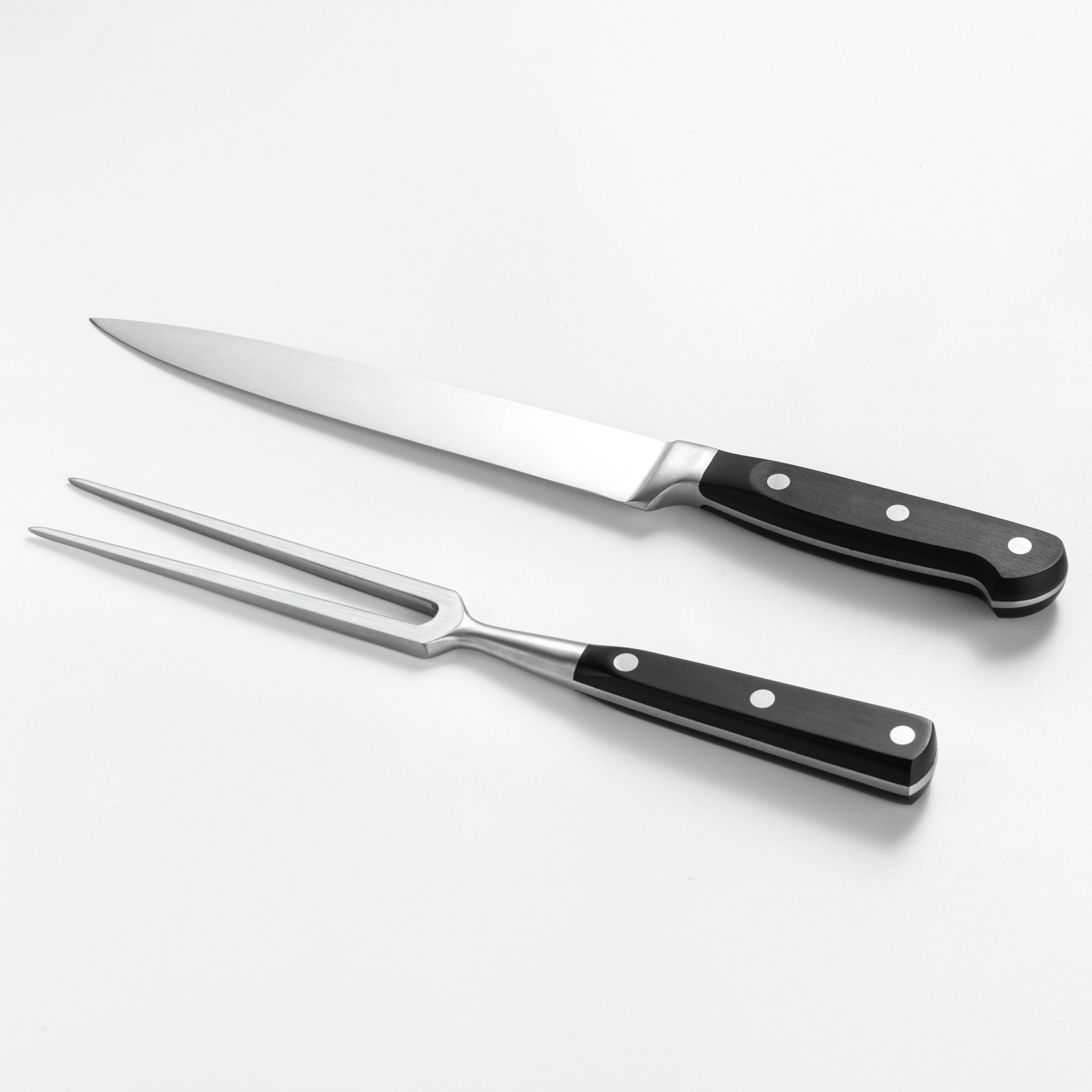 付属の二股フォークは肉をしっかりと固定できるため、滑らず安定したスライスが可能になり、食卓でも調理シーンでも活躍します。