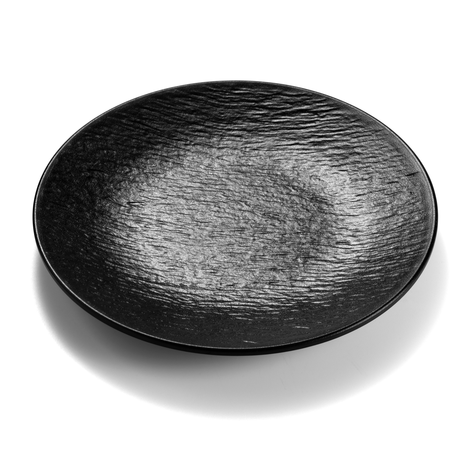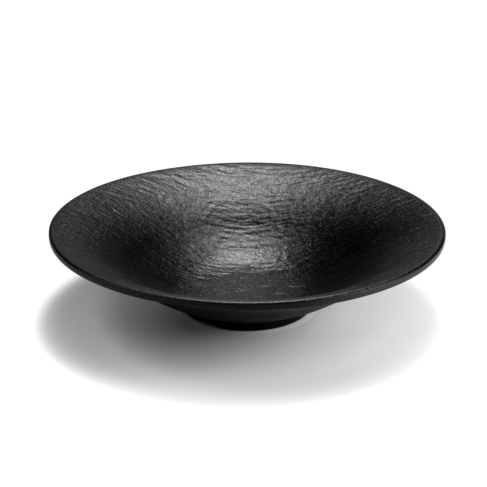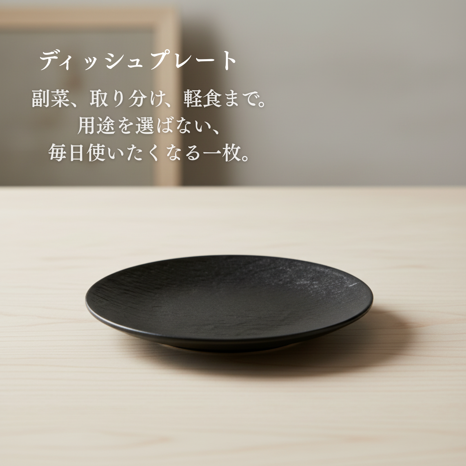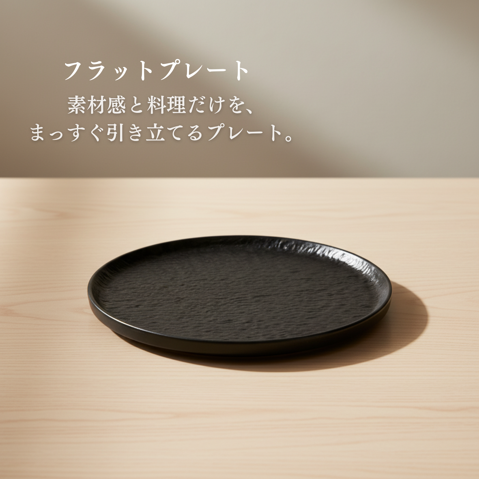 Kagiriのお皿セットは、盛り付けた料理を主役に引き立てることだけを考えてデザインしました。無駄を削ぎ落とした黒の佇まいと、わずかに揺らぎのある質感が、料理の色や湯気、光の陰影まで美しく映します。